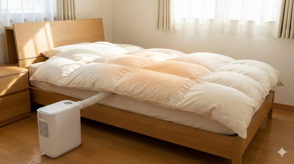ダニは50度で20〜30分、60度なら一瞬で死滅するとされています。家庭用布団乾燥機の「ダニ退治モード」は、この温度を維持するように設計されています。ただし、使い方が重要です。布団をただ乾燥機にセットするのではなく、掛け布団で乾燥マットをしっかりと包み込み、熱が逃げないように「熱のドーム」を作るイメージで使用してください。温度が上がりにくい四隅などは、ダニの逃げ場になってしまうため、途中で布団の向きを変えるなどして、全体を均一に加熱することが成功の秘訣です。