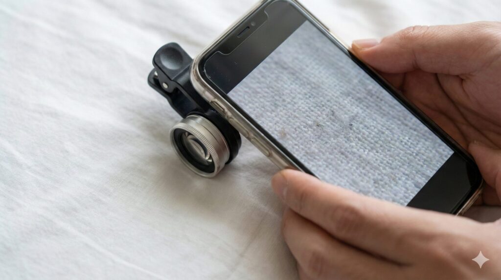 現代の最強ツールはスマートフォンです。ただし、そのままのカメラでは倍率が足りません。そこで、100円ショップやネットショップで販売されている「スマホ用マクロレンズ」を装着してみてください。黒い色画用紙や濃紺の布の上に、布団の縫い目付近の埃(ほこり)をパラパラと落とし、マクロモードでじっくり観察します。もし、その埃の中で「ゆっくりと動く微細な点」が見つかれば、それがダニです。ダニは暗い場所を好む(負の走光性)ため、明るい場所では繊維の奥に逃げ込もうとします。あえて暗い場所で数分放置してから、ライトを斜めから当てると表面に出てきた個体を見つけやすくなります。