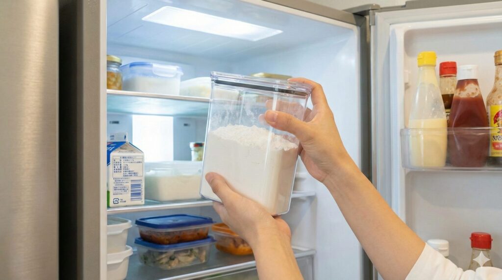 キッチン対策 開封後の粉製品は密閉して冷蔵庫へ入れる コナダニの侵入を防ぎ、パンケーキ症候群を予防する