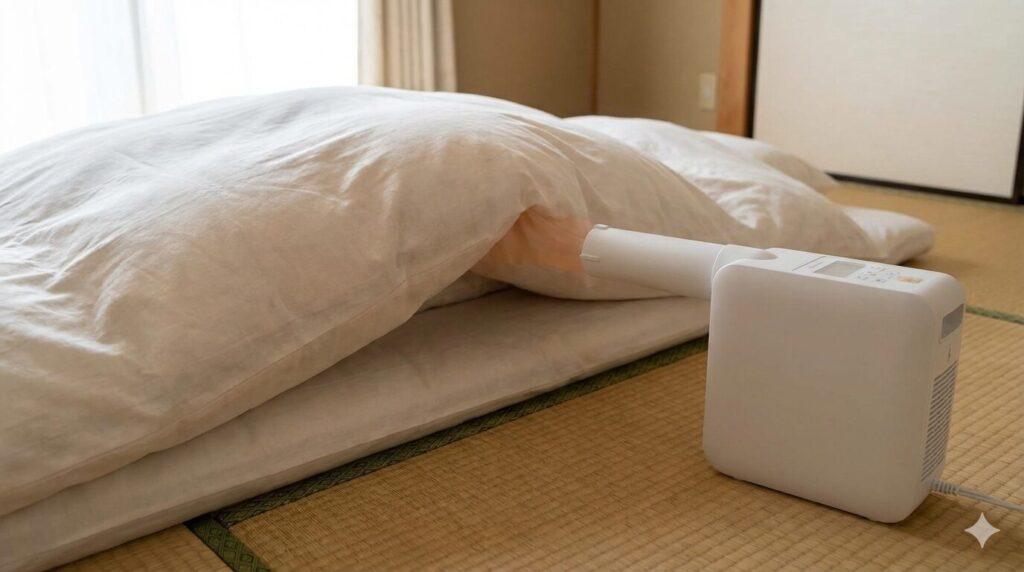 多くの布団乾燥機には「ダニ対策モード」が搭載されており、布団内部の温度をダニの致死温度まで引き上げてくれます。天日干しでは、表面の温度は上がってもダニが温度の低い中心部や裏側へ逃げてしまうため、実はほとんど殺虫できません。布団乾燥機なら、逃げ場をなくすように熱を閉じ込めることができるため、効果が段違いです。布団の四隅まで熱をしっかり届かせるために、掛け布団の上からさらに大判の毛布などを被せて熱を逃がさない工夫をすると、より駆除の成功率が高まります。