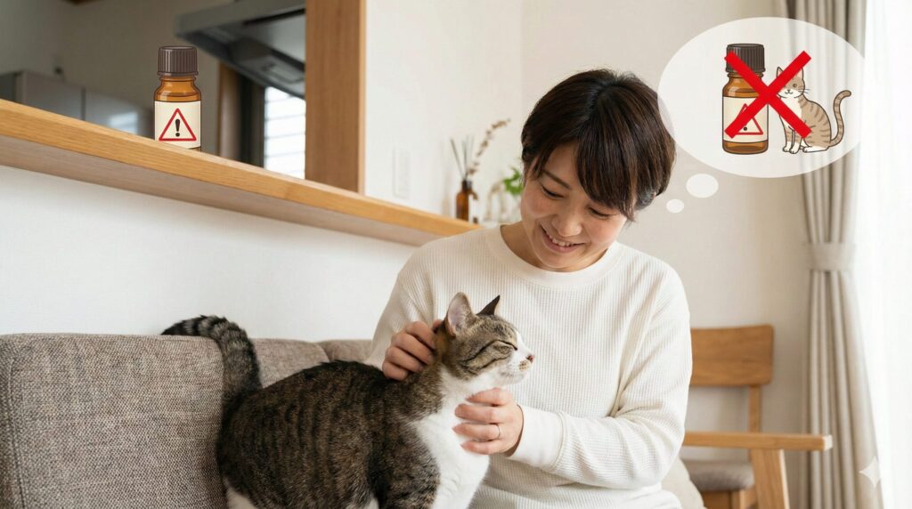 特に危険なのは、ハッカ油(ペパーミント)、ティーツリー、クローブ、柑橘系、オレガノなどです。これらが含まれた「ダニが嫌いな匂いのボディクリーム」を塗った手で猫を撫でたり、抱っこしたりするのは絶対に避けてください。たとえ微量であっても、毎日蓄積されることで突然発症するケースもあります。猫がいる家庭でのダニ対策は、匂いに頼るのではなく、物理的な掃除や、動物病院で処方される猫専用のノミ・ダニ予防薬を主軸にすべきです。大切な家族を守るために、ここは絶対に妥協しないでほしいポイントです。