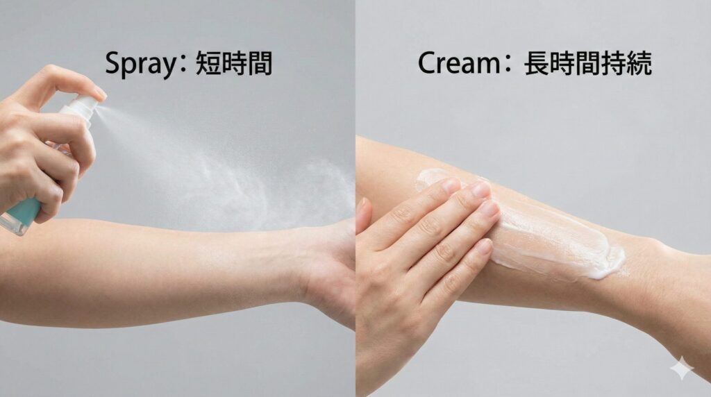 なぜ私がこれほどまでにスプレーではなくクリームを推すのか。それは、科学的な言葉で言うと「徐放性(じょほうせい)」に優れているからです。一般的に市販されている虫除けスプレーの多くは、アルコール(エタノール)に忌避成分を溶かしたものです。アルコールは蒸発しやすいので、吹きかけた直後は強力に香りますが、数十分もすれば成分のほとんどが空気中に逃げてしまいます。これでは、寝ている間の数時間や、長時間のハイキングをカバーするのは難しいですよね。