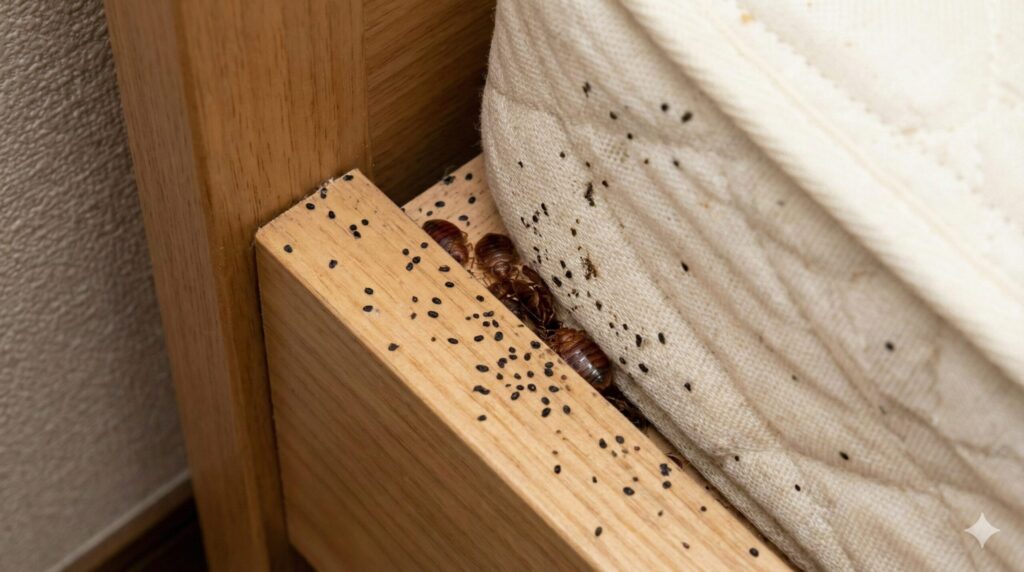 トコジラミは非常に賢く、昼間はベッドのフレームの隙間、コンセントカバーの裏、カーテンの折り目などに隠れています。夜になり人間が寝静まると、二酸化炭素を察知して這い出し、露出している手足や首筋などを執拗に刺します。刺された跡が数日遅れて猛烈に痒くなることもあり、ダニと混同されやすいのですが、寝具の隙間に黒いゴマのようなシミ(血糞)があったり、夜中にライトを照らして動く虫を見つけたりした場合はトコジラミを疑うべきです。