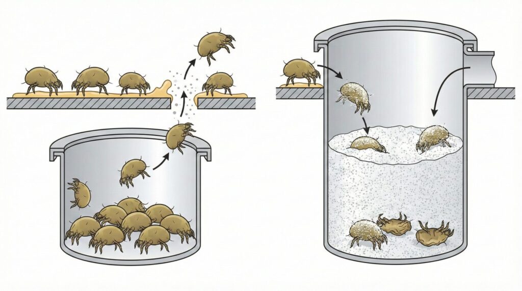 ただし、配置には注意点もあります。人の肌に極端に近すぎる場所に置くと、誘引剤に引き寄せられたダニがシートに入る前に、近くにいる人間を刺してしまうリスクがあるからです。枕の真下よりも、少し離れた足元付近のマットレスの間に設置する方が、安全にダニを誘導できると言われています。また、誘引剤の香りが強すぎる場合、部屋全体にダニを拡散させてしまうのではないかと心配される方もいますが、誘引範囲は通常1〜2メートル程度なので、その範囲内に正しく設置することが重要です。