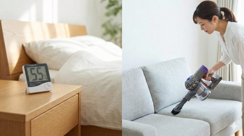 それと同時に、ダニのエサを絶つことも重要です。ダニの主食は、人間のフケ、垢、食べこぼし、そしてカビなどです。どんなに高価なシートを置いても、周りに豪華な食事が散らばっていたら、ダニはわざわざシートの中に入ってくれません。シーツや枕カバーをこまめに洗濯し、掃除機で部屋の隅々まで埃を取り除くことは、一見地味ですが「ダニを増やさない」ための強固な土台となります。私は湿度計を各部屋に置いて、60%を超えないようこまめにチェックするようにしています。