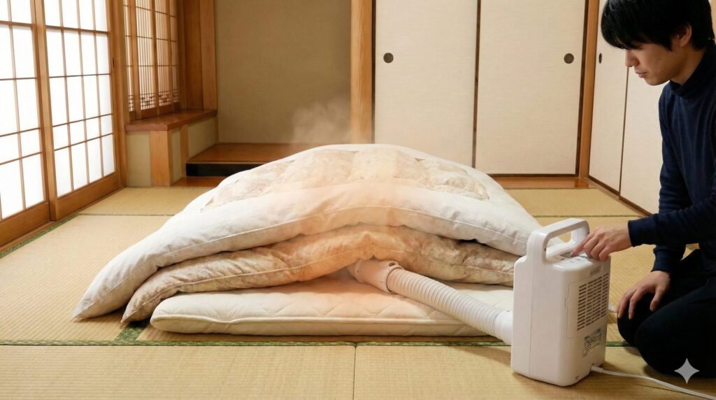注意点として、熱を当ててダニを死滅させた後は、必ず掃除機をかけてください。死滅したダニの体は乾燥して壊れやすくなっており、そのまま放置すると粉々になって布団の中に残り続け、強力なアレルゲンになってしまうからです。布団乾燥機で「殺す」、掃除機で「吸う」、最後にシートを置いて「残りを防ぐ」。この3ステップが、私の経験上もっとも効果的でした。