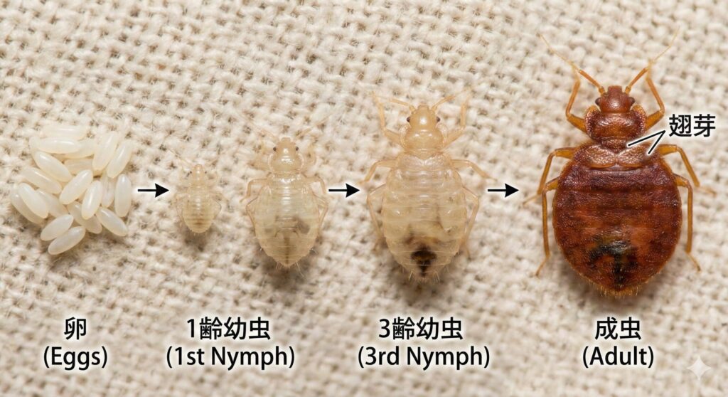 トコジラミは「不完全変態」という育ち方をする昆虫です。卵から孵化した後、幼虫は成虫とほぼ同じ形をしていて、5回の脱皮を繰り返して大きくなります。この成長過程を知っておくことは、早期発見において非常に重要です。なぜなら、「トコジラミの幼虫には、羽の痕跡(翅芽)すら存在しない」からです。