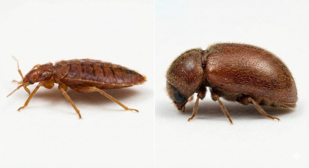 例えば、よく間違われるカツオブシムシやシバンムシを横から見てみると、彼らは体がふっくらとしていて、断面が丸みを帯びています。また、背中の「質感」も重要です。トコジラミの背中は細かい横縞模様が見えますが、これは腹部の節が透けて見えているものです。対して羽を持つ虫たちは、背中の表面が羽で覆われているため、質感も滑らかだったり、硬い光沢があったりします。