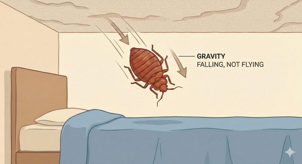 彼らは夜になると、吸血源である人間から発せられる二酸化炭素や体温を察知して移動を開始します。このとき、最短距離でターゲットに近づこうとして、壁を登り、そのまま天井を伝って寝ている人の真上まで移動することがあるんですね。しかし、トコジラミは吸盤のような構造を持っていないため、滑らかな材質の天井や、ちょっとした振動、あるいは空調の風などの影響で、足場を確保できずにポトッと落下してしまうことがあるんです。これを海外の害虫対策の現場では「シーリング・ドロップ(天井からの落下)」と説明されることがあります。
