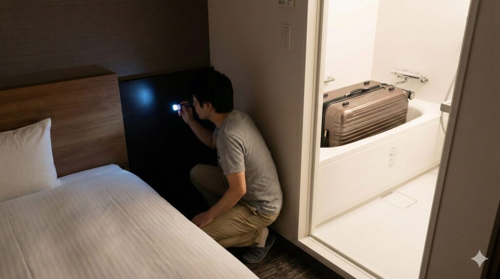旅行先での防御策として、入室直後のルーチンを身につけましょう。まず、荷物をベッドやカーペットの上に直接置いてはいけません。トコジラミはプラスチックや金属などの滑らかな面を登るのが苦手なので、「バスタブの中」や「荷物置きのラックの上」に一旦置くのが安全です。その間に、ベッドのシーツをめくって四隅に血糞がないか、ヘッドボードの裏に虫がいないかを素早くチェックしてください。もし痕跡を見つけたら、すぐにフロントへ連絡して部屋を変えてもらうべきです。この際、隣室も汚染されている可能性があるため、できるだけ離れた部屋を希望するのがコツです。