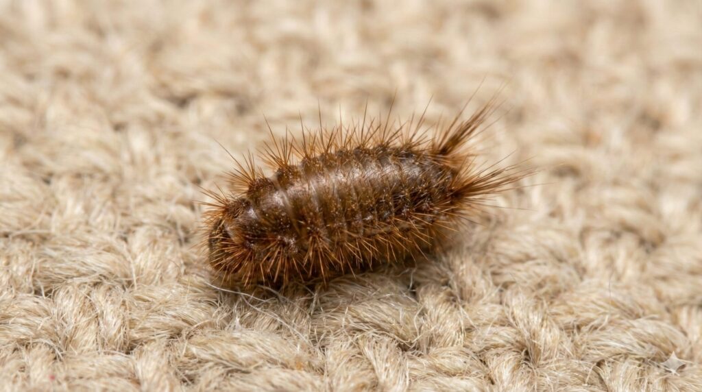 家庭内で「茶色い虫の抜け殻」を見つけた際、トコジラミと最も誤認されやすいのがヒメマルカツオブシムシの幼虫です。この虫はカツオブシムシ科の昆虫で、タンスの中の衣類や乾物をエサにする、日本では非常にありふれた害虫です。春先にクローゼットの隅などで抜け殻が見つかることが多いため、「トコジラミが出た!」とパニックになる方が多いのですが、実は落ち着いて見れば全くの別物であることが分かります。まず、形状の違いですが、トコジラミの抜け殻が「脚のある昆虫の形」を保っているのに対し、ヒメマルカツオブシムシの抜け殻はどちらかというと「細長いイモムシ状」や「ラグビーボール型」をしています。