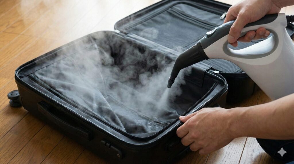 スチームクリーナーでスーツケースの隙間を熱消毒