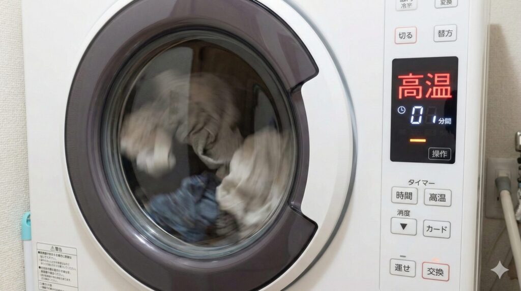 家庭用の乾燥機であれば、設定を「高温」にし、最低でも30分から1時間程度回してください。特にジーンズのポケットやパーカーのフード、靴下の厚手の部分などは熱が届きにくいため、余裕を持って長めに設定するのがコツです。もし家庭用乾燥機の温度上昇が不安な場合は、コインランドリーにある業務用のガス式乾燥機を利用することを強くおすすめします。業務用のものは内部温度が80℃以上に達するため、家庭用よりもはるかに強力で確実です。私も大量の荷物があるときは、袋に密閉したままコインランドリーへ持ち込み、一気に高温処理をしてしまいます。