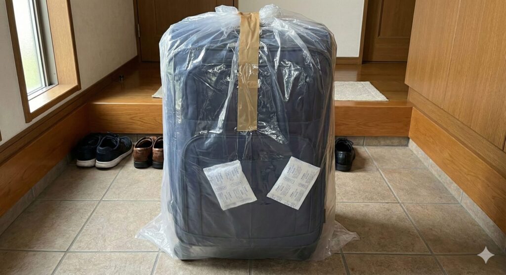 目視チェックで異常がなかったとしても、トコジラミが100%いないと断言するのは困難です。彼らは驚くほど巧妙に潜伏するため、念には念を入れて「隔離」を行う必要があります。ここで最も役立つのが、45リットルから90リットルサイズの特大ポリ袋です。帰宅後、玄関先でのチェックが終わったら、スーツケースをそのままポリ袋に入れ、空気を抜きながら口をガッチリと縛って密封してください。こうすることで、中に潜んでいた個体が部屋の中に這い出して、畳やカーペット、壁紙の裏に定着してしまうのを物理的に防ぐことができます。