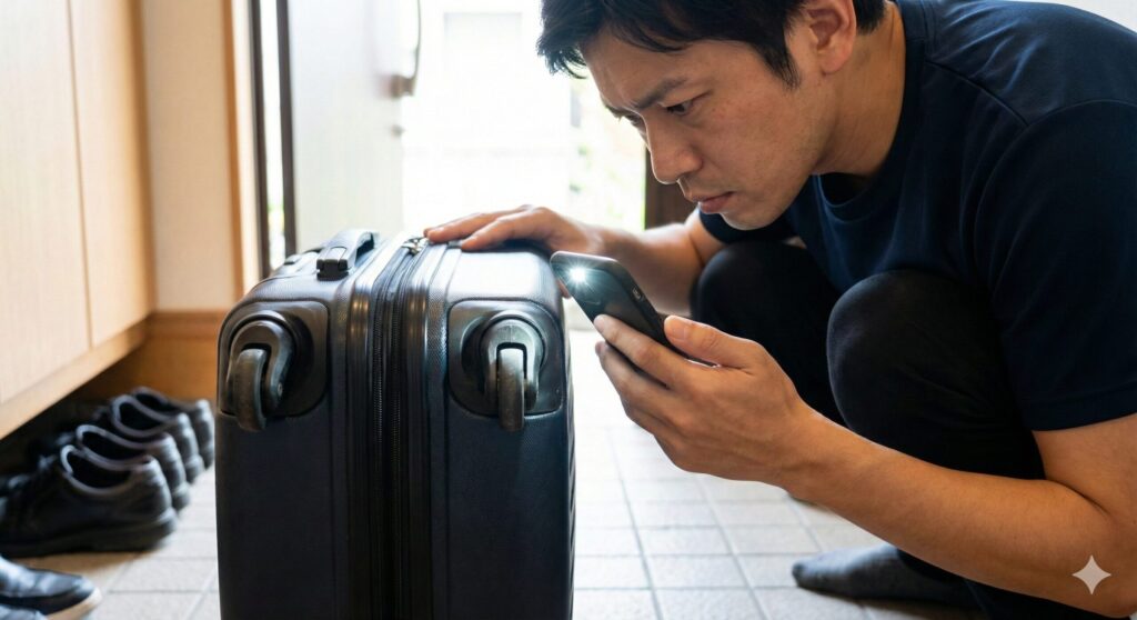 無事に帰宅しても、すぐにスーツケースをリビングへ持ち込むのは避けてください。トコジラミは成虫で5〜8mm程度ですが、幼虫はもっと小さく、卵に至っては1mmほどの白い粒で肉眼では見落としがちです。まずは玄関の外、あるいはマンションの共用廊下などの広い場所で、荷物の「外側」を徹底的に調べましょう。特に注意が必要なのが、スーツケースの「ファスナーのスリット部分」「底面のキャスター周辺」「取っ手の付け根」です。トコジラミは非常に平べったい体をしており、クレジットカードが入るほどの隙間があればどこにでも入り込めます。