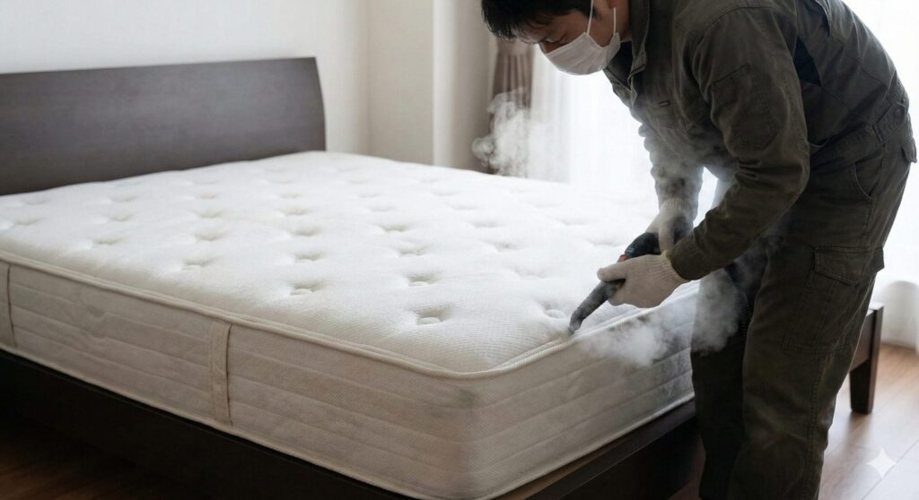 - スチームクリーナー:薬剤を使いたくないマットレスやソファの隙間に有効です。ただし、蒸気が表面をなでるだけでは不十分で、ノズルをゆっくりと押し当てて内部まで熱を届ける必要があります。