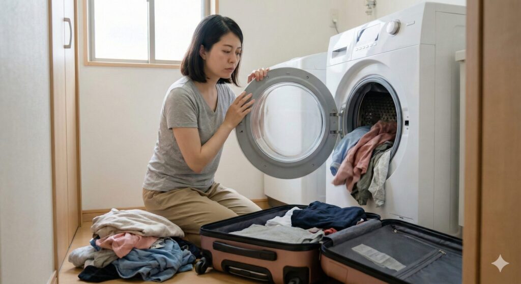 厚手のポリ袋(45L以上)を用意し、できれば二重にして密閉するのが鉄則です。薄いゴミ袋だと、移動中にハンガーの角や衣類の装飾で袋が破れ、そこから虫が這い出してしまうリスクがあります。必ず丈夫な袋を選び、口をしっかりと縛ってください。また、スーツケースやカバンは隙間が多く、トコジラミにとって格好の隠れ家です。これらを別の部屋へ移動させると、そこが新たな繁殖拠点になってしまいます。移動させる際は、必ず袋に入れたまま運び、洗濯機や乾燥機の直前で開封し、開封後は袋をすぐに廃棄するようにしてください。詳しい荷物の扱いについては、以下の記事で詳しく解説しています。