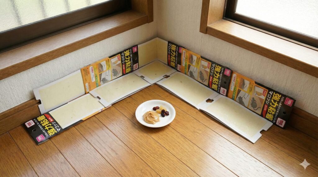 - 大量連結設置:ネズミは粘着シートの端に触れると驚いてジャンプすることがあります。その着地地点にもシートがあるように、最低でも3〜5枚を連結させて「粘着の道」を作ります。