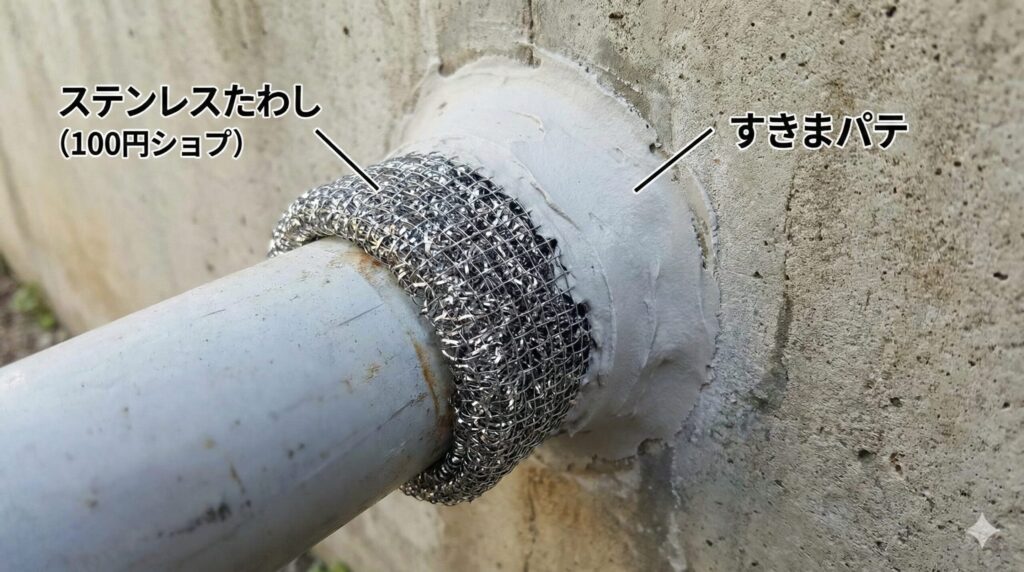 こうすることで、物理的な硬さによって侵入を防ぎやすくなります。パテの表面をかじられることはあっても、中の金属たわしがストッパーとして機能し続けてくれます。この方法は、エアコンダクトの壁の貫通部や、基礎のひび割れ部分など、大きな隙間を安く埋めたい時に活用しやすい方法です。まずは身近な100均資材を組み合わせて、隙間のない家を目指しましょう。
