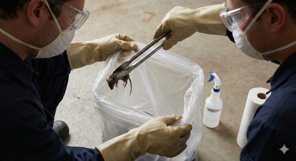 もし死骸の場所が特定できて、自分で処理しようと決めたなら、まずは「自分の身を守ること」を徹底してください。ネズミの死骸には、さまざまな細菌や寄生虫が存在する可能性があります。例えば、尿や体液に触れた場合、感染症リスクが指摘されています。(出典:国立感染症研究所『レプトスピラ症』)。安易に近づかず、以下の手順を遵守しましょう。