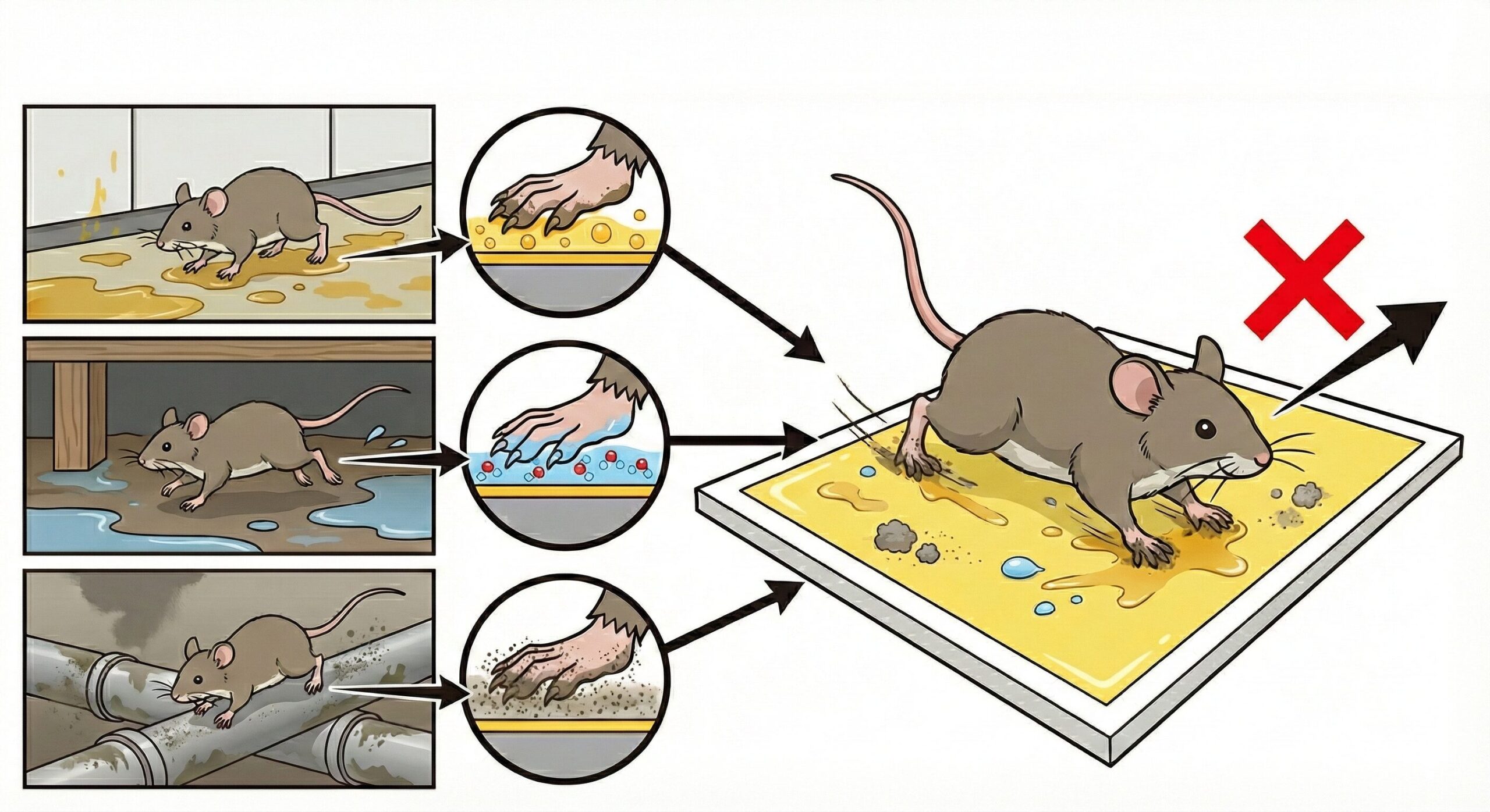 ネズミが粘着シートの上を歩いた形跡があるのに捕まっていない場合、その最大の原因は「足の裏の汚れ」にあります。ネズミの主な活動拠点である厨房、床下、排水管周辺などは、水分、油脂、埃が充満している過酷な環境です。ネズミがこれらの場所を通過する際、その足の裏には汚染物質がびっしりと付着しています。