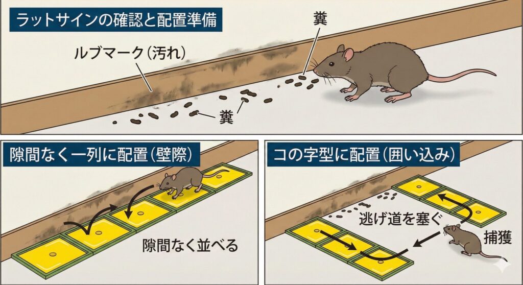配置の際は「面の制圧」を意識してください。1枚だけ置くのは、ネズミに「ここを避けて通ってください」と回避を助長する配置になってしまいます。基本は3枚から5枚、多い場所では10枚程度を、隙間なく敷き詰める、またはジグザグに配置します。ネズミの歩幅やジャンプ力を考慮し、着地地点が必ず粘着面になるように設計するのです。また、壁際ではシートを「コの字型」に折り曲げて設置することで、肢だけでなく背中や側面の毛も粘着剤に接触させることができ、脱出の確率を下げることが可能です。ネズミの心理を読み、彼らが「ここを通らざるを得ない」状況を作り出すこと。これが、罠設置において重要な考え方の一つです。
