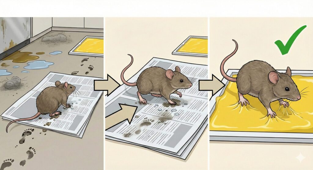 特に対策の実務において重要なのが、この新聞紙の活用法です。ネズミ捕りに失敗する人の多くは、買ってきたシートをそのまま床に直置きしています。しかし、前述の通りネズミの足は汚れています。この汚れを物理的に除去しない限り、どんなに強力な粘着剤もその真価を発揮することはありません。