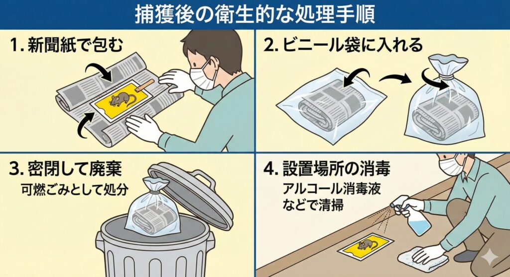 捕獲できた場合は、できるだけ早めに処分することが重要です。放置すると腐敗臭が漂うだけでなく、他のネズミに警告を与えてしまいます。ネズミはレプトスピラ症、サルモネラ症、イエダニによる吸血被害など、多くの病原体や寄生虫の媒介者です。死骸や排泄物には決して素手で触れないでください。
