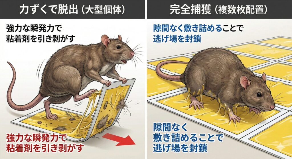 一番の問題は、「一部の足だけが接地した状態で踏ん張れる環境」です。1枚だけポツンと置かれたシートに足をかけた際、他の足がシートの外側、つまり粘着力のない床面に触れていると、そこを支点にして全身を力ずくで引き抜くパワーが生まれます。ネズミは4本の足のうち、1本でも自由が効けば、そこから驚異的な粘り強さで脱出を試みます。特にドブネズミは湿潤な環境に適応した高い脚力を有しており、1枚のシートでは全身を拘束しきれないことが多いです。エサだけを巧妙に盗っていく個体も、重心をシートの外に残したまま首を伸ばして食べるなど、物理的に「捕まらない体勢」を維持する知恵を持っています。このように、個体の筋力と設置の甘さが組み合わさることで、脱出の成功率を高めてしまっているのが現状と言えるでしょう。