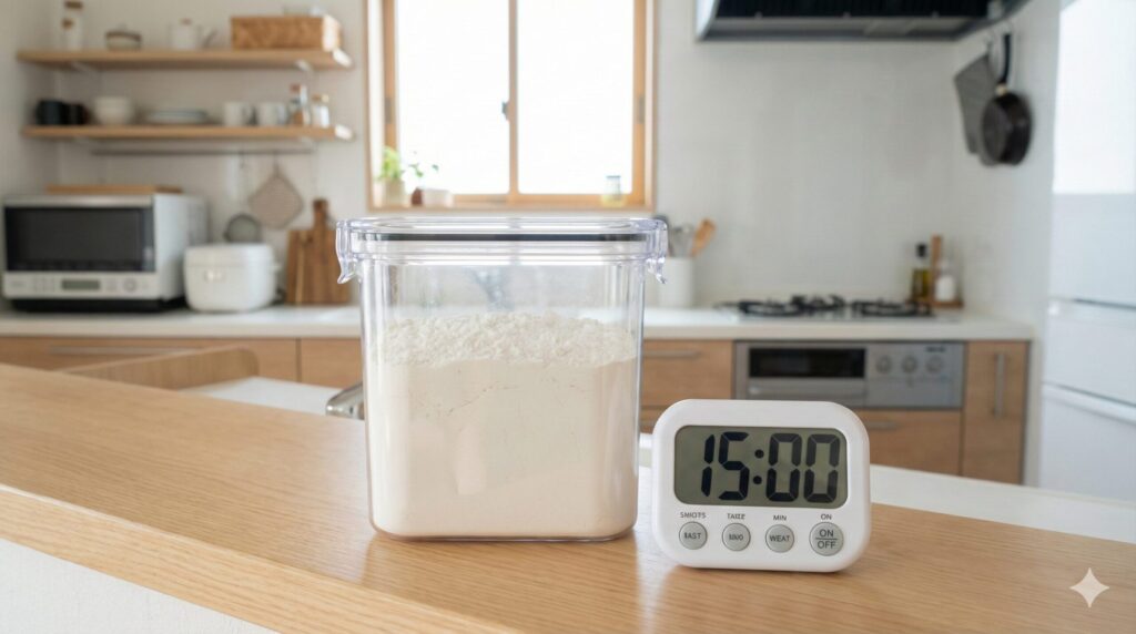 アレルギー対策の面では「冷蔵庫保存」が推奨されますが、ここで最大の敵となるのが「結露」です。冷蔵庫から冷えた粉を出し、すぐに蓋を開けて使うと、外気との温度差で粉に水分がつき、カビやダマの原因になってしまいます。これを防ぐには、私が実践している「15分ルール(目安)」を取り入れてみてください。