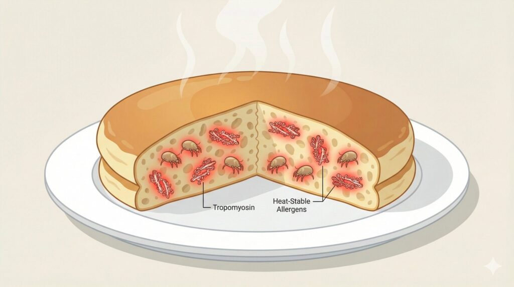 多くの方が「火を通せば殺菌されるし、虫も死ぬから大丈夫」と信じていますが、実はこれが一番大きな間違いなんです。小麦粉に発生するコナダニやチリダニが原因で起こる「パンケーキ症候群(経口ダニアナフィラキシー)」の厄介なところは、ダニが生きているか死んでいるかは関係がないという点にあります。アレルギーを引き起こす主犯格は、ダニの体に含まれる「トロポミオシン」というタンパク質です。