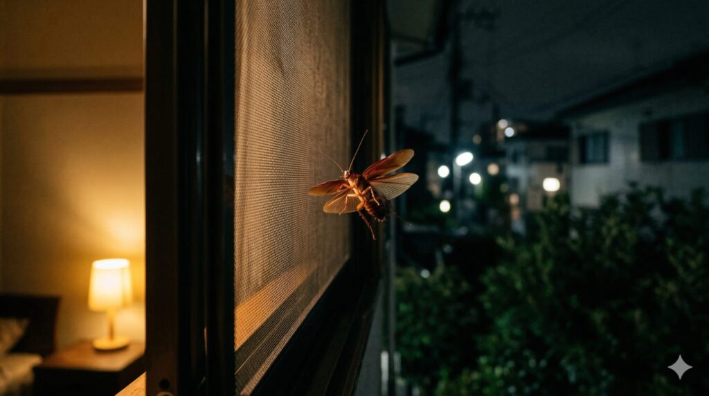 また、近隣の電柱や街路樹、あるいは隣接する建物の高い位置から滑空して二階のベランダへ着地するパターンも無視できません。二階だから窓を開けていても大丈夫、という思い込みは非常に危険です。たとえ網戸をしていたとしても、網戸自体の立て付けが悪かったり、網目が破れていたりすれば、飛来した個体は即座に室内へと侵入してしまいます。ちなみに、家の中で飛ぶ虫を見かけた際、それがもしトコジラミではないかと不安になる方もいるかもしれませんが、トコジラミには羽がありません。詳しくはトコジラミに羽はある?飛ぶ虫との見分け方と正体を徹底解説の記事で解説していますが、二階の窓から飛び込んでくる「素早く動く茶色い虫」の多くは、残念ながらゴキブリである可能性が高いです。夏の夜間は、特に高所からの飛来を警戒する必要があります。