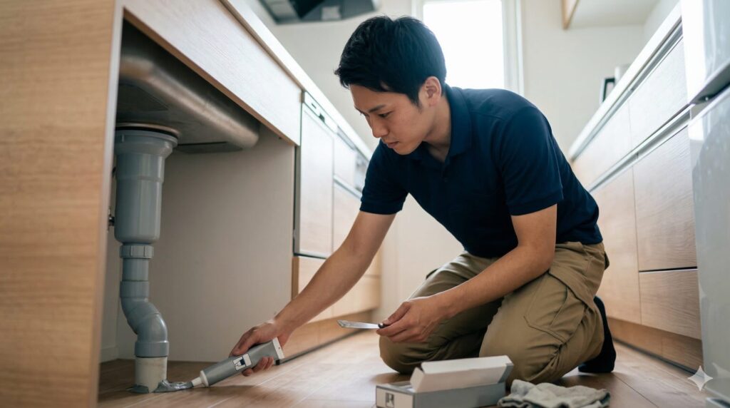 - キッチン・洗面台下の配管貫通部をパテで隙間なく埋める