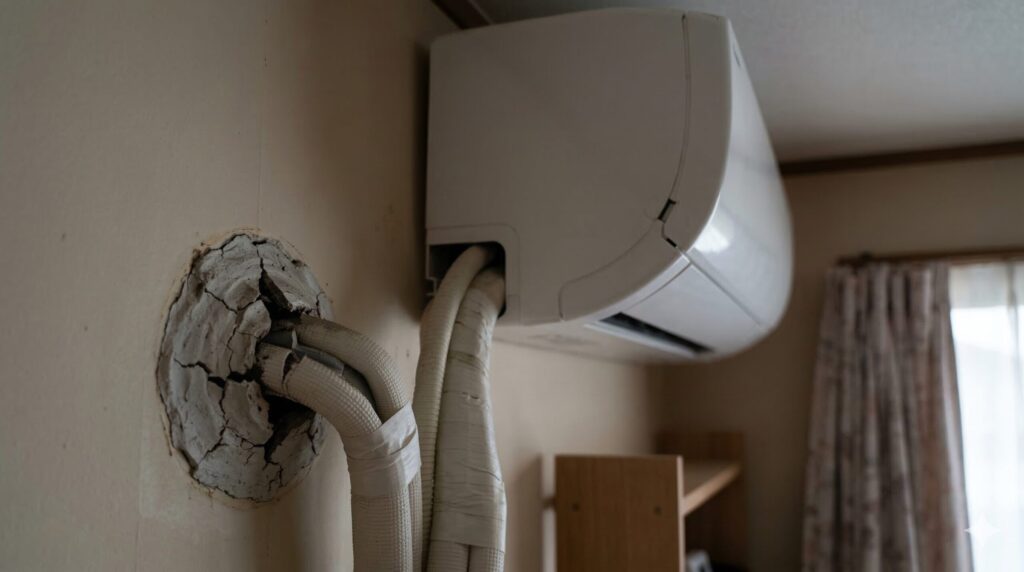 二階の個室に設置されたエアコンは、現代住宅における侵入経路の一つとして代表的な存在です。エアコンは室内機と室外機を繋ぐために、必ず壁に「スリーブ穴」という穴を開けています。通常、この穴は粘土のようなパテで塞がれていますが、このパテが曲者です。年月が経つと乾燥してひび割れたり、自重で垂れ下がって上部に隙間ができたりします。このパテのわずかな隙間こそが、外壁を登ってきたゴキブリにとっての室内への入り口になります。